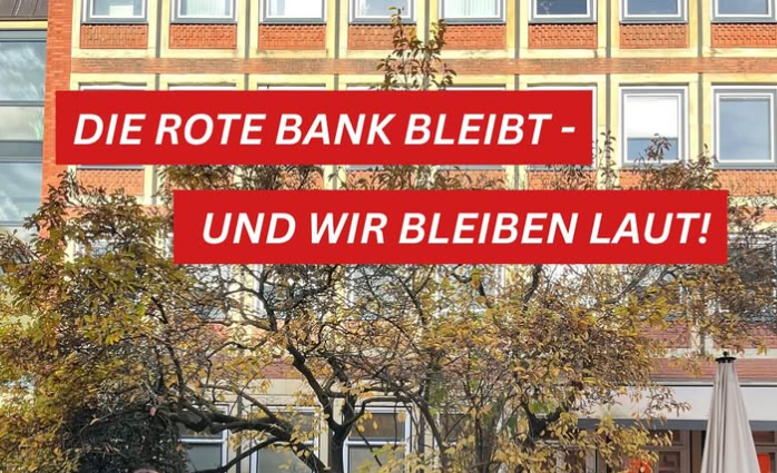 Alle Meldungen Wir haben es geschafft!Vor zwei Wochen wurde beschlossen, dass die Rote Bank für die nächsten drei Jahre einen festen Platz in Münster bekommt.Vom 8. März bis zum Weihnachtsmarkt steht sie vor dem Stadthaus 1 –und während des Weihnachtsmarkts bis zum 8.März sichtbar am Adolph-Kolping-Platz. Diese Entscheidung ist das Ergebnis von gemeinsamem Druck, […]
